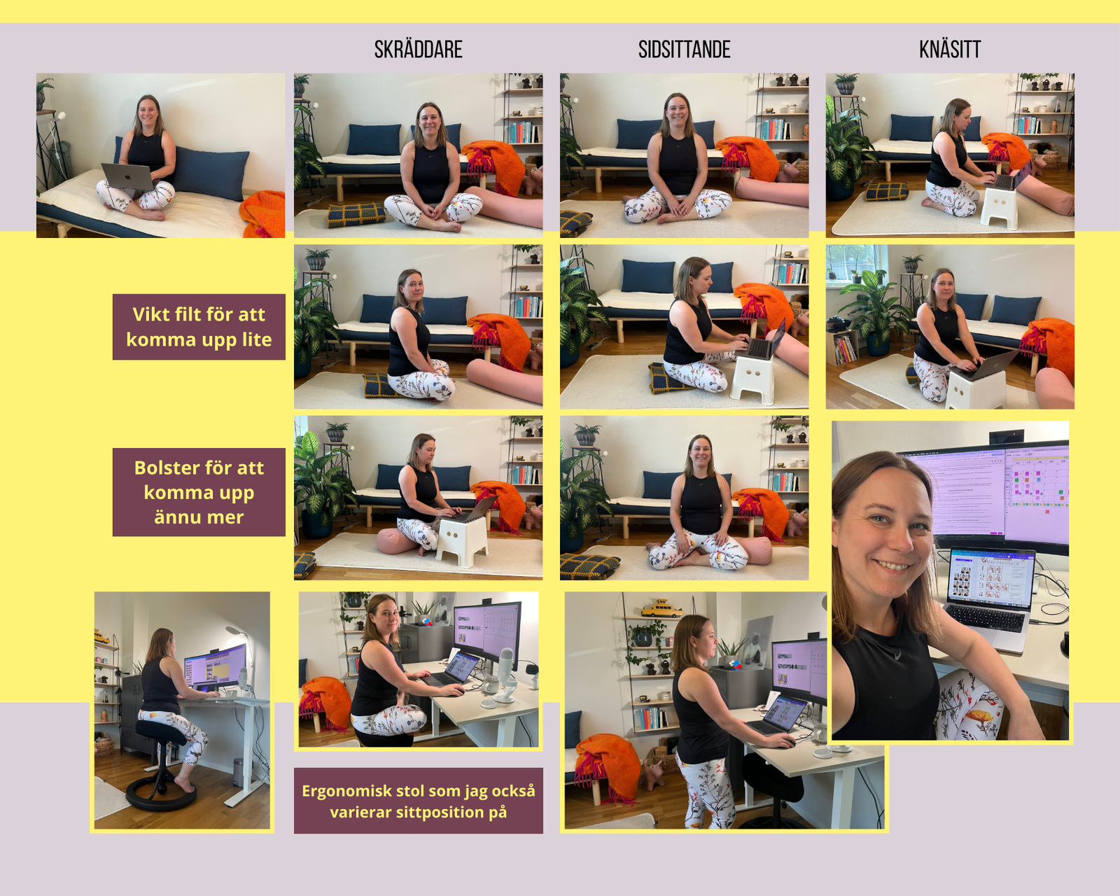 Under digitala möten där jag mest behövde lyssna kunde jag sitta och göra lite Sensing Yoga samtidigt – sidsittande övningar, gungrörelser och mjuka stretchar. Det blev en naturlig paus i arbetsdagen som gav min kropp välbehövlig rörelse och variation.
